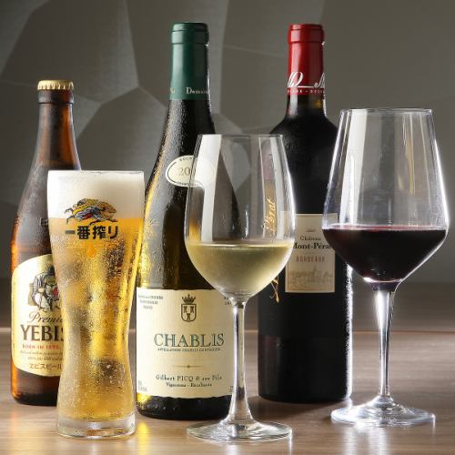 【豊富なお酒で料理とのペアリングも楽しめる】ビールや焼酎、ワインなど幅広い種類のお酒を取り揃えています。料理との相性を考えたセレクトも魅力で、接待や友人との食事、デートなど、どんなシーンでも心地よい時間を演出します。